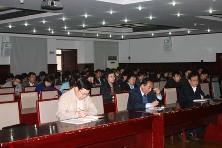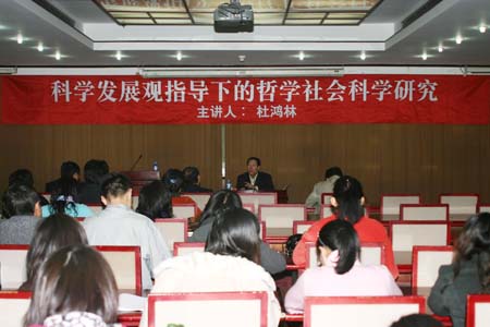 然后杜鸿林教授从三个方面讲述了科学发展观指导下的哲学社会科学研究的主题。在第一个部分中,杜教授主要对科学发展观进行了深入地阐述,他首先总结了此次科学发展观的学习与往日政治理论学习的不同,是在于更加重视自我分析、自我批评,将目光更多地投向自身。然后又深入浅出的概括了中国特色社会主义理论的渊源与起点,分别是毛泽东思想与邓小平理论。接着,杜教授又对马克思主义教育学院如何深入学习实践科学发展观进行了指导。他强调,科学发展观的第一要义是发展,而对于马列学院来讲,发展的指标有很多重,包括学院的规划效果如何、学生的愉悦程度如何等;科学发展观的核心是以人为本,因此马列学院要注重兼顾所有成员的根本利益;科学发展观的基本要求是全面协调可持续,因此学院要注重发展的整体性、均衡性与连续性;科学发展观的根本方法是统筹兼顾,因此学院在学习实践科学发展观活动的过程中,要总揽全局、统筹兼顾,立足当前、着眼长远,全面推进、重点突破,兼顾各方、综合平衡。