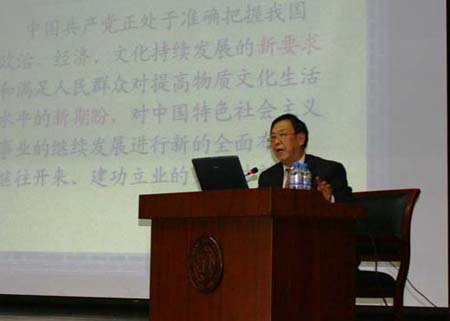 赵院长在时长两个小时的报告会中用幽默风趣、通俗易懂的语言,分别从中华民族伟大复兴的历史进程、全面发展中国特色社会主义事业的机遇与挑战、马克思主义中国化的历史进程三个大的方面详细阐述了科学发展观的重大意义。接下来,他用形象的“坐标系”给中国所处的历史阶段进行定位,从时间坐标上看,中国由鸦片战争到现在,逐渐走向现代化,也正逐渐实现中华民族的伟大复兴;从空间坐标来看,中国的发展水平与发达国家还有巨大差距,并面临新兴发展中国家的强势追赶,科学发展时不我待;从思想坐标来看,我们必须坚持中国特色社会主义,与两种错误倾向作斗争,不能否定改革,更不能放弃党的领导。他指出:以胡锦涛为总书记的党中央站在时代高度,根据世情、国情、党情的发展变化,坚持了党的三代领导集体关于发展的重要理念,又深入总结国内外在发展问题上的经验教训,科学分析我国发展进程中面临的各种新情况新问题,提出了“科学发展观”的重要发展战略。科学发展观不仅是国家经济社会发展的重要战略,更是我们日常生活、学习的重要指导思想,他鼓励师生在各方面都要努力践行科学发展观,使科学发展观真正落到实处。