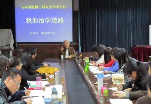 (通讯员:王倩倩)2011年10月28日下午三点,马列学院博士研究生学术论坛在范孙楼218进行。著名历史学家魏宏运教授应邀,以“我的治学道路”为题与大家分享了他的治学经历与体验,五十多位博士、硕士研究生参加了此次讲座。