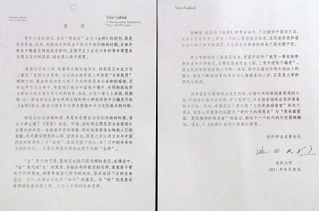 池田大作先生在贺词中说:我期盼,这一份由各位认真钻研周总理的伟大事迹而亲手主编发行的《金桥》杂志,能成为维系中日青年情感和中日友好基石的刊物。他同时表示,《金桥》杂志不仅能将中国与日本,也会永远将世界上所有人们的心紧密结合起来,进而能促使和谐社会与持久和平的实现。
