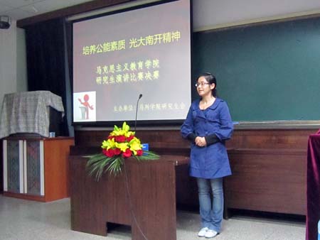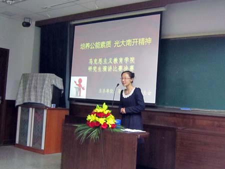 此次决赛是在21日上午进行演讲初赛的基础上进行的,主题为“培养公能素质,光大南开精神”,共有十名选手晋级决赛,决赛分为命题演讲与即兴演讲两部分,即兴演讲部分更是考验马列学子的逻辑思维能力,马列学院硕士研究生今天也来到现场关注此次决赛并为自己的同学加油助威。第一位选手魏娜同学以“没有左蓝的余则成”为题拉开了演讲决赛的帷幕。