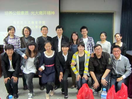 (通讯员:王倩倩)2012年4月23日晚,马克思主义教育学院第三届研究生学术文化节之演讲比赛决赛在范孙楼218会议室圆满结束。著名演讲家,军事学军事思想专业硕士研究生导师艾跃进教授作为特邀评委亲临演讲比赛现场;马列学院行政副院长陈平,团委书记马亚男与研究生辅导员袁婧也作为评委参与了此次活动。演讲决赛由马列学院研究生会主席郭威主持。