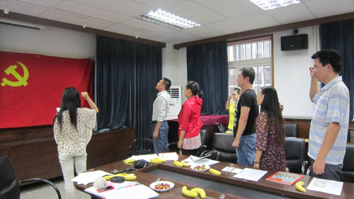 最后全体学生党员面向党旗重温入党誓词,座谈会在庄严、融洽的气氛中结束。