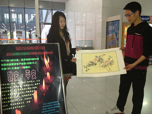 在活动开展中,多位老师同学都称赞了此次义卖的形式新颖,十分有意义。同时,活动负责人也接受了betway·必威西汉姆联电视台的采访,介绍了活动情况,并为雅安祝福祈祷。本次活动中购买作品捐款的人不仅有本校学生,还有老师和外校来南开考博的学生;让人感动的是,一些捐款者以高价买作品,是为了能为灾区多送去一点心意。