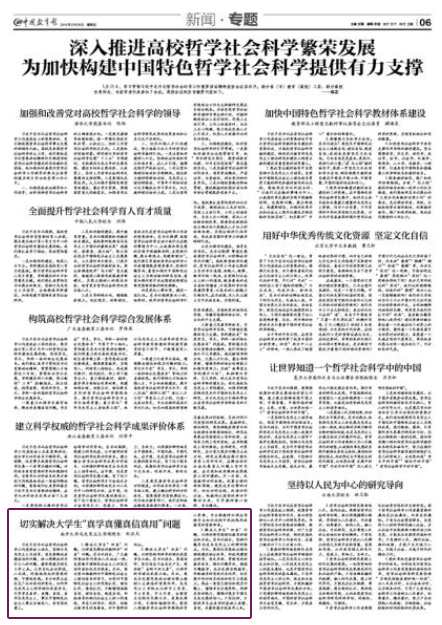一要着力加强学生教育培养,解决好真懂真信问题。学生在“学生、学术、学科一体的综合发展体系”中居于中心地位。贯彻落实总书记重要讲话精神,我们将着力深化高校党委书记、校长每学期上第一堂思想政治理论课制度,推进课堂教学、实践育人、网络育人相结合,形成课内课外、校内校外、网上网下教育合力;着力推进教材、教师、教学等方面综合改革创新,构建结构合理、功能互补、理论联系实际的哲学社会科学课程体系,提升哲学社会科学各专业学生培养质量;着力深化“青年马克思主义者培养工程”,把以马克思主义为指导的哲学社会科学教育渗透到学校教育教学的各个环节,不断提高育人质量。