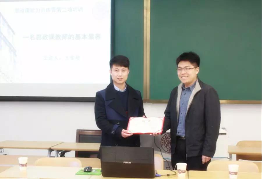 在“思政课能力训练营”培训中,学院校友、曾获全国高校思想政治理论课教学标兵、全国最美思政课教师,天津市五一劳动奖章、天津市高校思政课青年教师基本功大赛一等奖第一名、天津市高校青年教师基本功竞赛一等奖、天津市教育系统“教工先锋岗”等荣誉的天津师范大学讲师王雪超回到母校,为训练营学员作了主题为“一名思政课教师的基本素养”的分享。王雪超就“如何处理教材”、“如何设计课件”、“如何整理教案”等具体问题作了细致的交流。思政课讲授要以内容为主,方法为辅,要特别注意讲课内容的严肃性与方法的灵活性。近两个小时分享交流严肃活泼,幽默深刻。