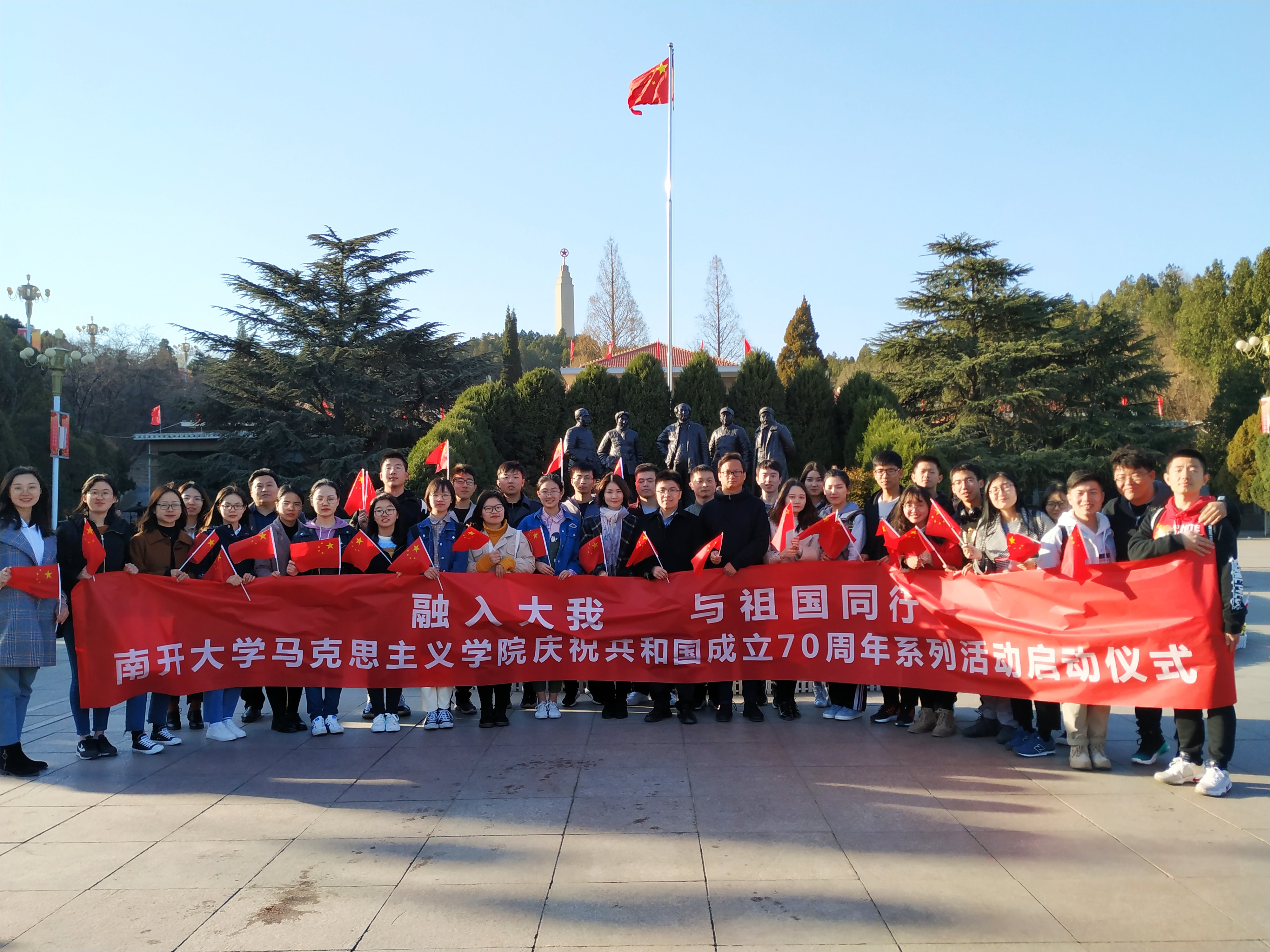 23日,必威betway西汉姆“融入大我与祖国同行”迎庆共和国70周年系列主题活动启动仪式在西柏坡纪念馆前广场举行,学生们进行了诗歌朗诵《少年中国说》,“西柏坡精神”主题宣讲等活动,学院“青年教职工发展协会”秘书长郑文娟代表青年教师阐述了对于西柏坡精神的理解和建功新时代的决心,学生代表2018级硕士生王惠惠发出倡议,秉承南开爱国传统,将小我融入大我,将青春奉献祖国。师生合唱《我和我的祖国》的歌声回响在纪念馆广场,吸引了过往游客的目光,纷纷加入到用歌声祝福祖国的行列。