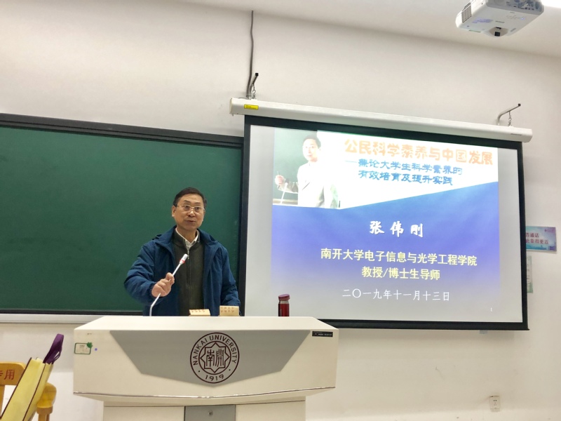 接着,张老师对科学素养的层次及价值进行讲解。科学素养,是素养概念的延伸和派生,包括科学精神、问题意识、基本科学知识和典型科研方法等方面。科学素养分为初级科学素养、中级科学素养和高级科学素养三个层次,真正具有科学素养的人是了不起的人,是有益于社会的人,是推动社会发展进步的人,即具有正能量的人,张老师呼吁每个南开学子都应该做这样的人。之后,张老师又分享了他对公民科学素养与我国发展之间的关系、科学素养培育提升等问题的看法。他以改革开放以来我国科技发展的重大成就为例,指出公民科学素养提升对于国家发展的重要意义,他认为,大学承担着这种教育和培养的重任。