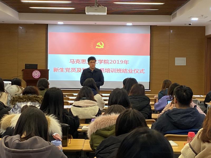 会议伊始,学院党校培训部负责人陈田田总结回顾了本期培训主要内容。本期培训班以学习贯彻习近平新时代中国特色社会主义思想和“不忘初心、牢记使命”主题教育为核心内容,通过讲座授课、观影体会、读书交流、话剧观看等多种形式对全体新生党员和预备党员开展教育,依托“红色大讲堂”举办了4场讲座,2场“可爱的中国”观影活动,1次“优秀党员面对面”分享交流会。此外,本期培训打破专业和年级的限制将全体学员分为5个小组,组长牵头组织了两次读书交流会,并进行了小组总结汇报。学院党校实践部负责人徐天意介绍了学院党员活动室的建设情况:党校在前期广泛征求意见和征集建设方案、实地调研的基础上,确定最终设计方案。党员活动室将分为党建文化展示区、党建荣誉展览区、党员阅读研讨区、支部风采展示区等几个功能分区,努力把党员活动室打造成党员教育和管理的新阵地,助力打造凝聚力强、战斗力强、号召力强的基层党组织。目前党员活动室施工改造已经基本完成,将于2020年春季学期正式投入使用。