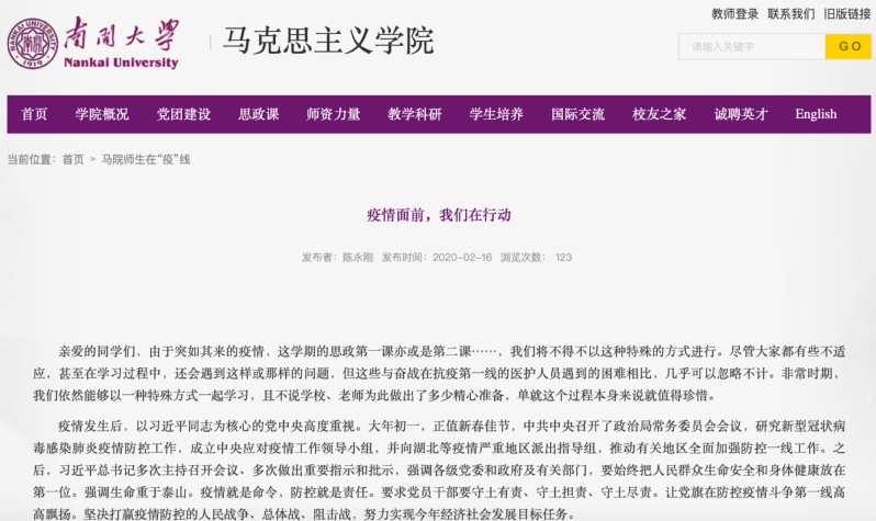 “亲爱的同学们,由于突如其来的疫情,这学期的思政第一课亦或是第二课……,我们将不得不以这种特殊的方式进行。”致全院学生的一封信,让学生感受到学校和学院的关心。希望同学们在疫情面前,不做局外人,要行动起来,积极主动把小我融入大我,发扬南开精神,用实际行动支持学校和基层疫情防控工作;做好自我防护,传播正能量,不信谣、不传谣,更不造谣;克服困难,抓好学习,保持身心健康……,为抗击疫情贡献自己的一份力量。