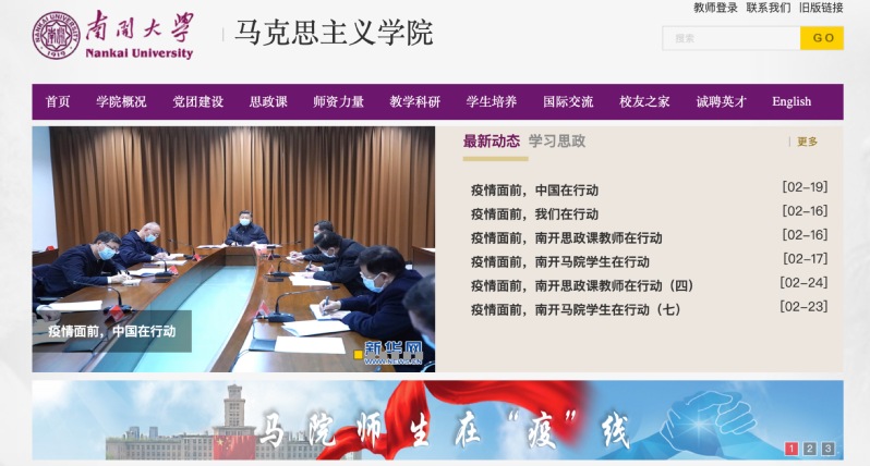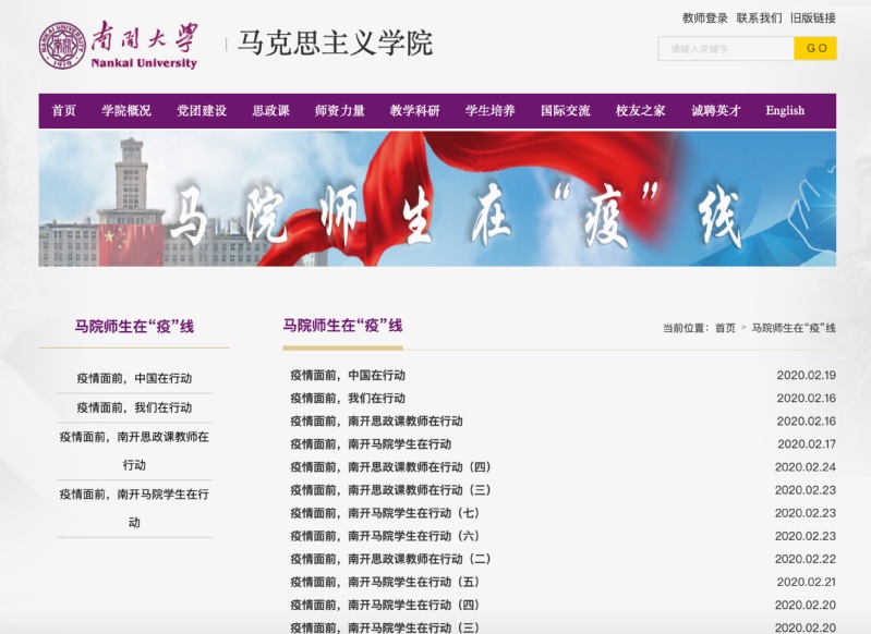 新冠肺炎疫情发生以来,必威betway西汉姆认真贯彻落实习近平总书记关于疫情防控的重要指示精神,严格落实教育部、天津市和学校相关工作要求和部署,全面贯彻坚定信心、同舟共济、科学防治、精准施策要求,学院第一时间成立疫情防控工作小组,整体谋划明确分工,借助学院网站、微信公众平台开设“马院师生在’疫’线”专题栏目,分为“疫情面前,中国在行动”、“疫情面前,我们在行动”、“疫情面前,南开思政教师在行动“、“疫情面前,南开马院学生在行动”等四个系列内容,全面展示马院师生在疫情面前的责任担当,让党旗在防控疫情斗争中高高飘扬,坚决打赢疫情防控的人民战争、总体战、阻击战。