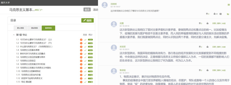 春季开学面对汹汹而来的新冠肺炎疫情,马原理教研室认真学习教育部46号令,强化在线课程建设力度,不停研、不停教、不停学。教研室老师利用微信群、腾讯会议等进行线上集体备课、集体讨论教学提纲和课程PPT,以超星学习通为主要平台,辅助利用微信群、腾讯会议、腾讯课堂以及雨课堂等多种平台与学生建立有效的授课途径和沟通方式,有效地进行了“线上+线下”融合的教学方式。同时,教研室老师积极发声,在人民网公开课频道发表教学方案和学习心得10余篇,多次获“学习强国”平台转载报道。