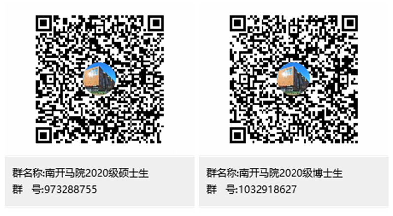 4.联系方式:学院团委陈老师022-23500739。同时邀请新生们实名加入“南开马院2020级硕士生”或“南开马院2020级博士生”QQ群。
