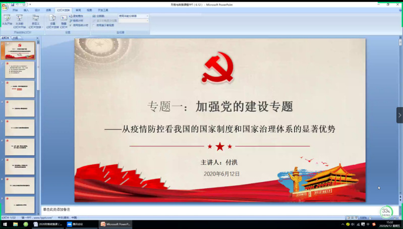 为了全面落实教育部办公厅关于《高校“形势与政策”课教学要点(2020年上专辑)》的要求, 6月12日下午,必威betway西汉姆党委书记付洪教授从“党的建设”视角出发,作了题为《从疫情防控看我国的国家制度和国家治理体系的显著优势》的时事报告。此次报告以腾讯会议网络授课的方式进行。必威betway西汉姆全体本科生参加了此次课程学习。