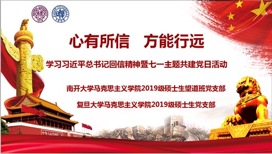 初心不改,九九如一。为庆祝中国共产党成立99周年,认真学习习近平总书记给复旦大学《共产党宣言》展示馆党员志愿服务队全体队员回信精神,重温习近平总书记给betway·必威西汉姆联8名参军入伍学生回信精神,激发青年党员将爱国之心化为报国之行的热情,在“七一”建党节当天,必威betway西汉姆2019级硕士生望道班党支部联合复旦大学必威betway西汉姆2019级硕士生党支部开展以“心有所信 方能行远”为主题的联学共建党日活动。必威betway西汉姆党委副书记、副院长刘一博老师,复旦大学必威betway西汉姆党委副书记潘孝楠老师,双方党支部全体党员、部分入党积极分子通过网络平台参加本次活动。