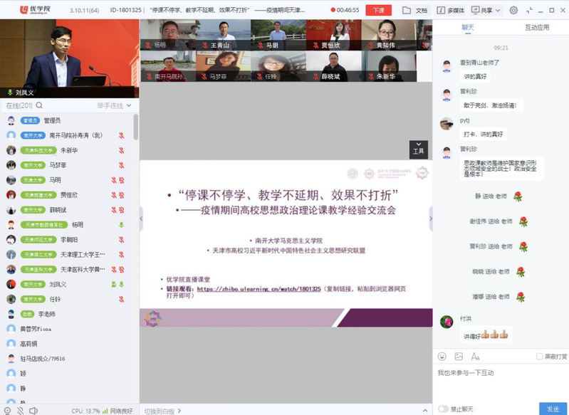 为学习贯彻落实全国教育大会、全国高校思想政治工作会议、学校思想政治理论课教师座谈会精神,更好地总结疫情期间思想政治理论课线上教学经验,进一步改进教学方法、深化教学改革、探索多元教学模式、提升教学质量,必威betway西汉姆联合天津市高校习近平新时代中国特色社会主义思想研究联盟,于6月24日在优学院直播课堂开展以“停课不停学、教学不延期、效果不打折”为主题的疫情期间高校思想政治理论课教学经验交流会。会议由必威betway西汉姆副院长孙寿涛主持,全市高校思想政治理论课教师同行参加了本次会议。