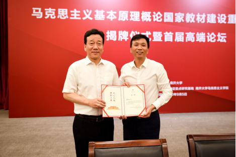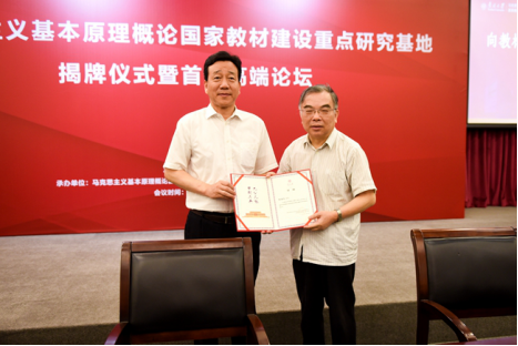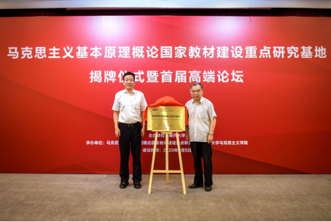 9月5日,“高校思想政治理论课马克思主义基本原理概论国家教材建设重点研究基地”揭牌仪式暨首届高端论坛在betway·必威西汉姆联举行。betway·必威西汉姆联党委书记杨庆山,毛泽东思想和中国特色社会主义理论体系概论国家教材建设重点研究基地主任、北京大学博雅讲席教授顾海良应邀共同为基地揭牌。betway·必威西汉姆联副校长王新生主持揭牌仪式。