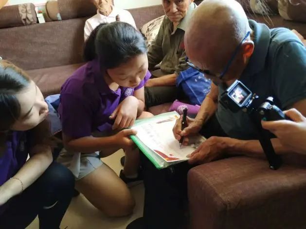 马绍官爷爷今年87岁,刚见到他时,他很用颤颤巍巍的声音告诉我们,由于他之前在战争中负伤,子弹打到了颈部,影响了声带的发声,导致几乎不能正常说话。我们只能通过文字或在其他老人的帮助下与他交谈。