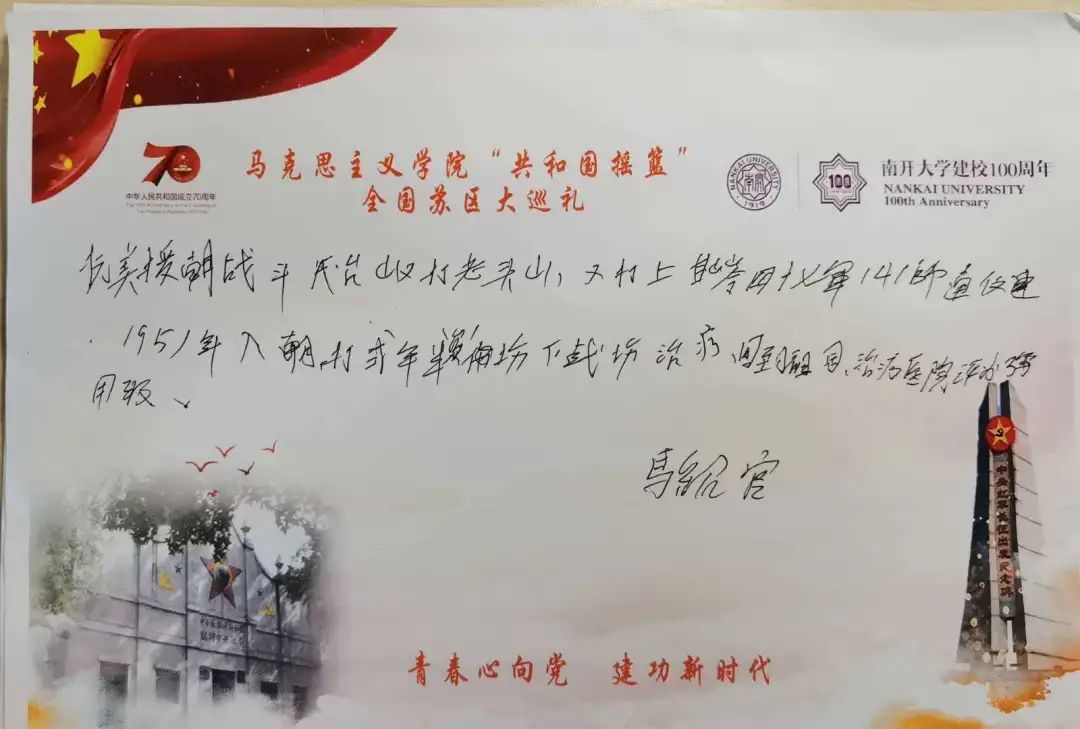 一年来,实践队成员始终关心生活在塔卧镇光荣院的“最可爱的人”,与院长保持通信了解老人们的生活近况与身体健康。今年是中国人民志愿军抗美援朝出国作战70周年,适逢作家魏巍诞辰100周年。1951年4月,魏巍撰写的战地通讯《谁是最可爱的人》在《人民日报》头版发表。“最可爱的人”从此成为志愿军的光荣称号。这篇通讯入选中学语文课本,影响了几代中国人。70年斗转星移,人们对“最可爱的人”的敬仰与缅怀,从未改变。他们不愧为中华民族的英雄儿女,无愧于“最可爱的人”的光荣称号。面对来自各方面的风险挑战,面对各种阻力压力,中国人民总能逢山开路、遇水架桥,总能展现大智大勇、锐意开拓进取,“杀出一条血路”!
