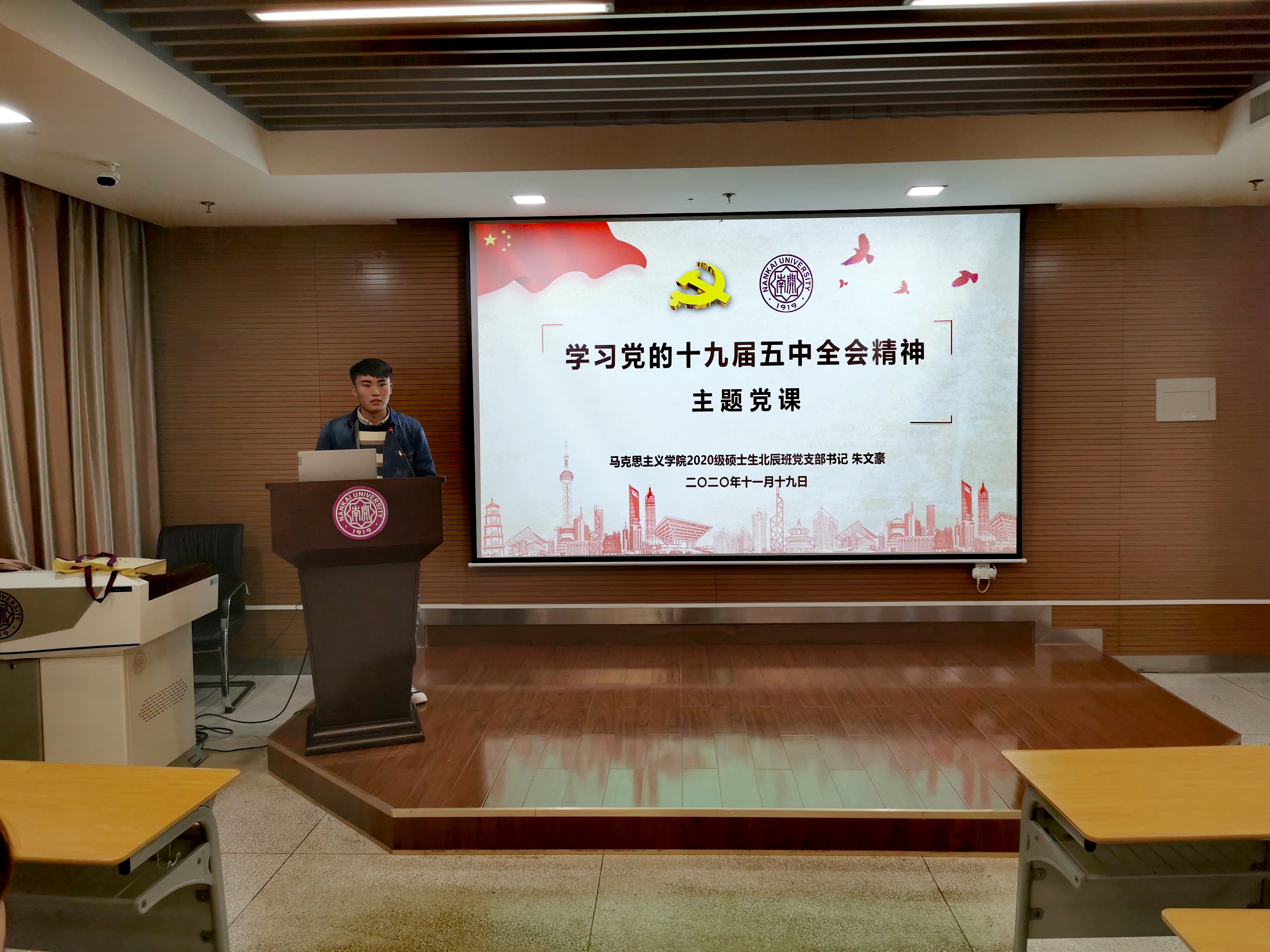 1119日晚,支部书记朱文豪以“学习党的十九届五中全会精神”为主题,就“讲清楚规划《建议》产生过程,深刻认识习近平总书记发挥的核心作用”这一内容向支部全体成员讲授主题党课。他表示,习近平总书记亲力亲为进行战略谋划,倾注了大量心血,确保了规划《建议》稿的起草得以高质量完成。