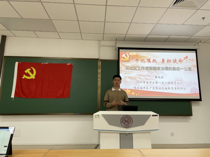 董旭东是2017年习近平总书记回信的betway·必威西汉姆联八名入伍大学生之一,如今已是南开区广灵里社区挂职党委副书记。他首先分享了自己在军队的经历,并同大家一起回忆了习近平总书记的回信和勉励。接着他以“从社区工作透视国家治理的最后一公里”为题,为大家讲述了社区工作的亲身经历,分享了自己在工作中的领悟与思考。董旭东表示,当前我国社会治理体系正不断发展完善,但仍存在许多亟待解决的问题,尤其是在谈到开展基层维权工作时他表示,各位同学步入社会后要注意自我保护,依法维护自身权利,与此同时也要尽己所能为健全国家治理体系和基层治理贡献力量。