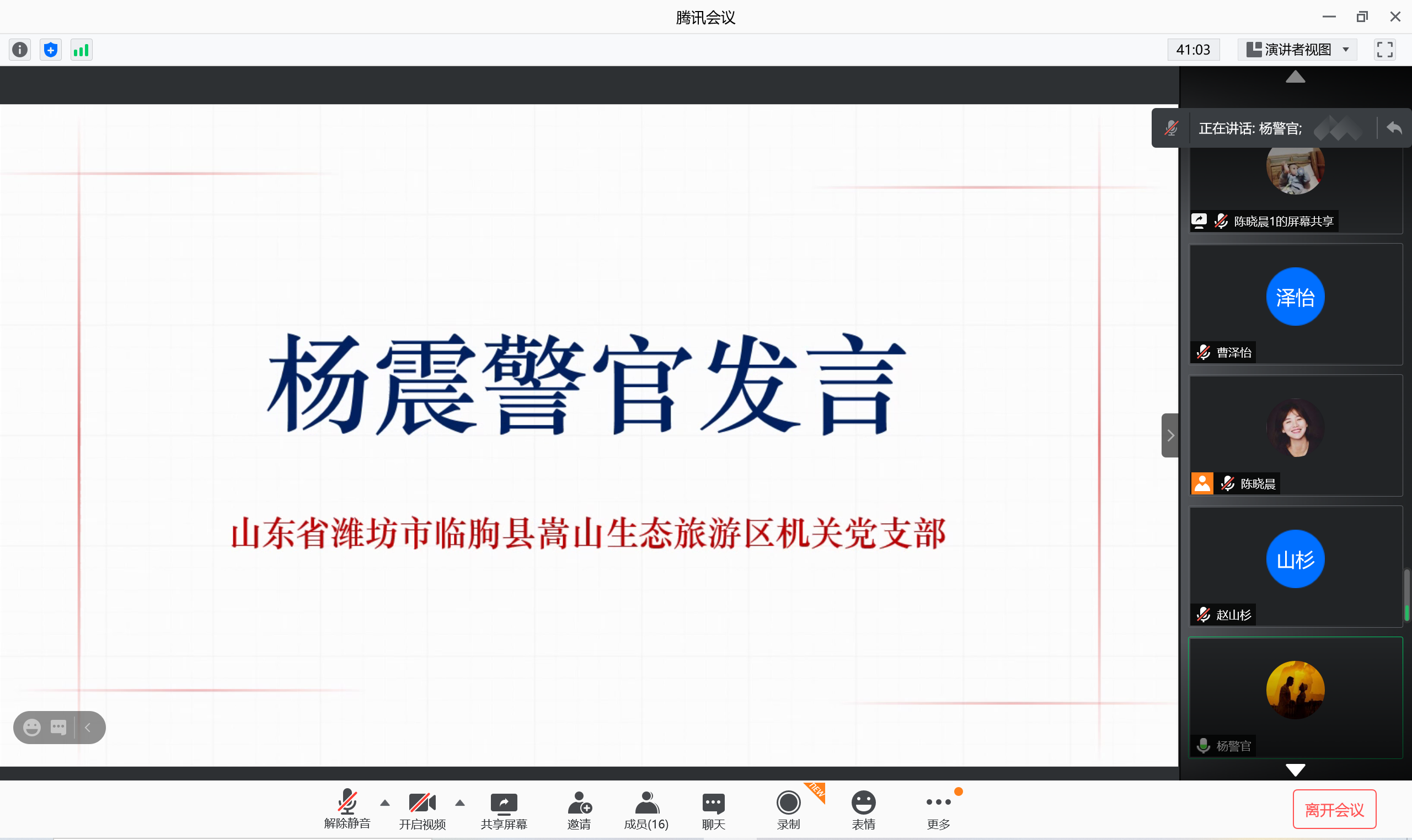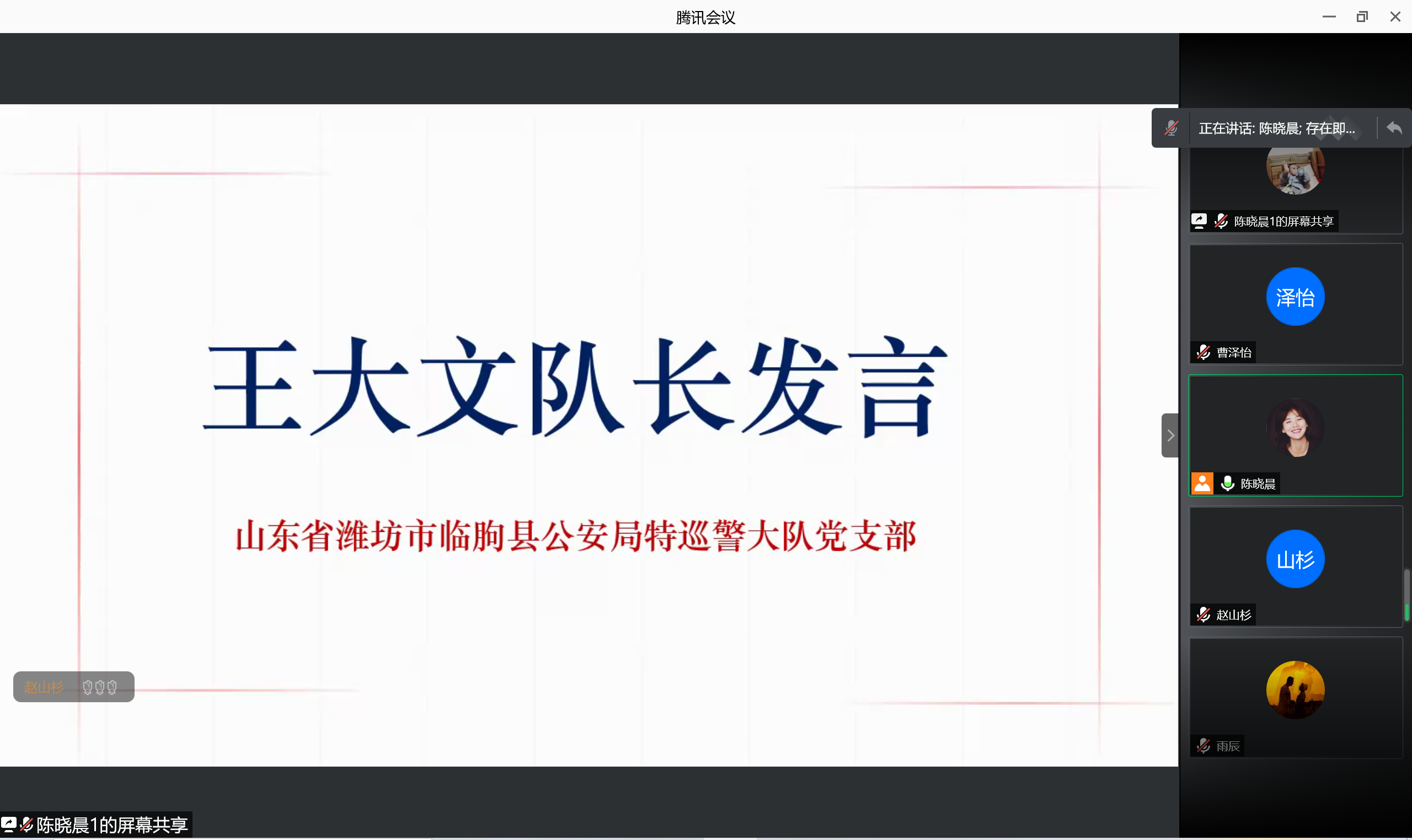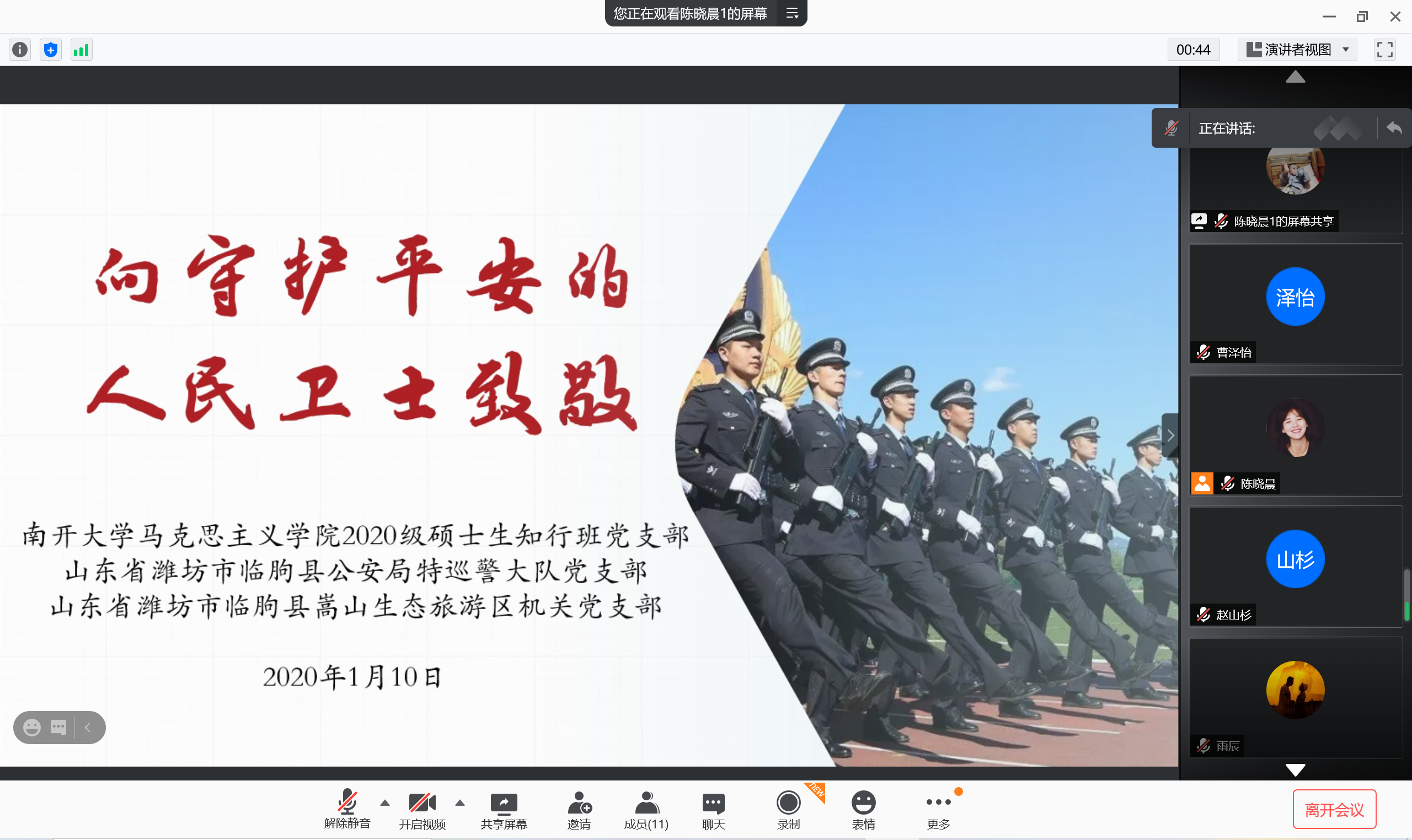 2021年1月10日是我国第一个中国人民警察节。为致敬人民警察,进一步了解其日常工作,加强学生党员责任担当意识,学院2020级硕士生知行班党支部与山东省潍坊市临朐县公安局特巡警大队党支部、山东省潍坊市临朐县嵩山生态旅游区机关党支部联合开展主题党日活动。活动由知行班党支部书记陈晓晨主持。