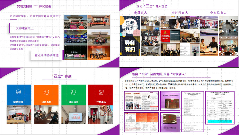 打造“四维”并进载体。“学”有广度。以理论研讨、知识竞赛等形式,举办学习交流活动70余场。“研”有深度。带头开展大学生思想研究,发表核心论文2篇,主持2项天津市重点课题。学生课外理论立项9项、“知行南开” 2项,承办“校长杯”专项赛,参与市院课题51项,不断提升学生对重要讲话精神的领悟。“讲”有温度。围绕“四史”等主题,到海河中学等数十个单位,为6000余人做75场主题宣讲。 “行”有力度。以身示范,组织70余名学生参与抗疫志愿服务,在学院网站开设专栏,展示马院人的抗疫事迹。今年寒假100余名学生开展实践,献礼建党100周年。以红色为主题,开展实践、党团班建、晚会、话剧、文化节等,传承和发扬革命精神,筑牢信仰之基。