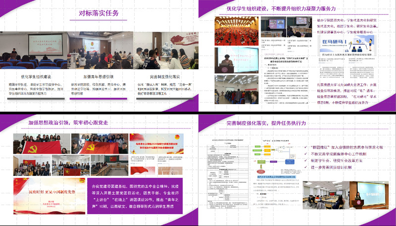 党团班一体化建设。已实现全部16个研究生班级“党团班一体化”建设,学院团委副书记担任本科党支部书记。不断提升党团班的有效协调,统筹安排。
