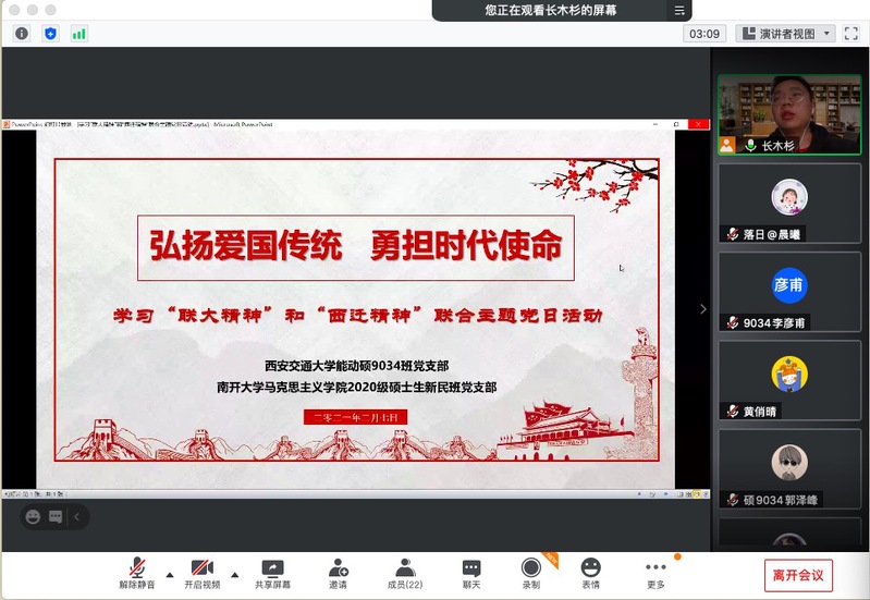 2月7日晚,学院2020级硕士生新民班党支部联合西安交通大学能源与动力工程学院硕士生9034班党支部线上举办“弘扬爱国传统,勇担时代使命”主题党日活动,共同学习“联大精神”和“西迁精神”,厚植学生党员爱国情怀,强化学生党员责任担当。学院党委专职组织员殴喜乐、新民班党支部党建指导员董旭东、交大能动学院团委书记雷驰与两支部全体党员参会,新民班党支部书记张登彬主持。