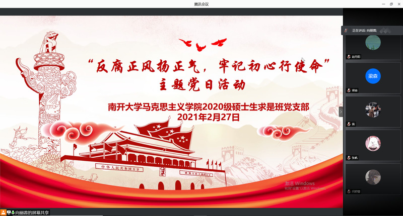 2021年2月27日,学院求是班党支部开展“反腐正风扬正气,不忘初心记使命”主题党日活动。求是班党支部纪检委员向丽蓉同志主持本次活动。