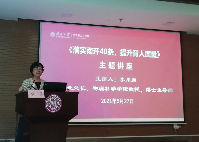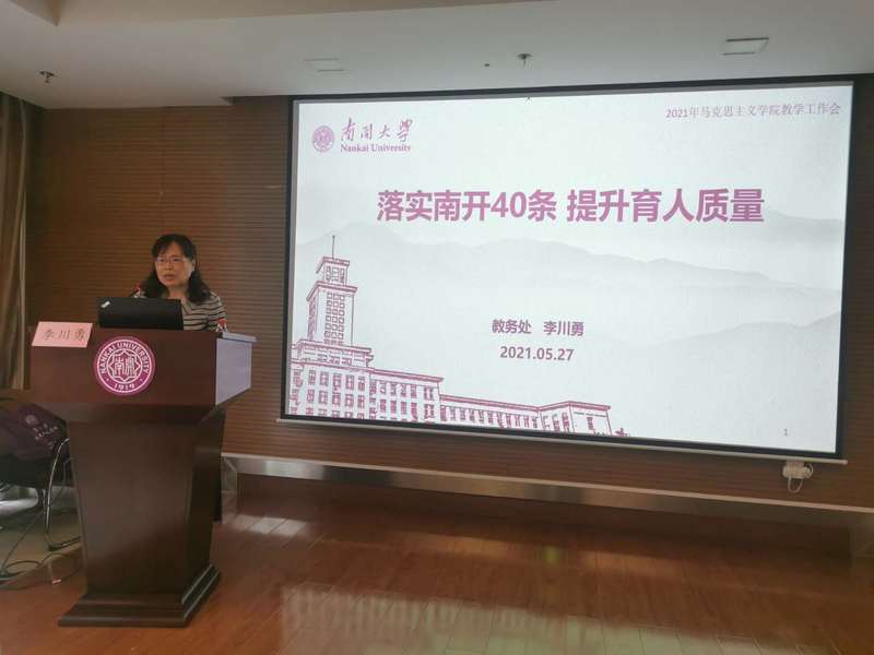 首先,李老师对“南开40条”出台及其要点进行了回顾。“南开40条”作为betway·必威西汉姆联一流本科教育质量提升行动计划,以“公能”素质教育为主线,以教师的积极性和学生的主动性为主体,抓主体协同、抓评价激励、抓质量文化,力图在培养模式、育人等方面实现突破。其次,李川勇处长就“南开40条”的落实情况进行了介绍。主要涉及十个方面:一、把思想政治教育贯穿人才培养全过程;二、加强教育教学改革创新的制度设计;三、围绕促进学生全面发展优化通识教育体系;四、构建多样化特色化人才培养体系;五、打造以学为主教学相长的“师生共同体”;六、全面提高教师教书育人能力;七、推进现代信息技术与教育教学深度融合;八、全方位深化国际合作育人;九、加强实验实践教学和创新创业教育;十、推动一流本科教育质量文化建设。其中,她特别就老师们关心的一流课程建设和申报要求、教学型职称评审要求和改革趋向等进行了重点介绍。最后,她对2021年学校的重点工作进行了介绍。2021年的工作重点是在稳步落实南开40条的同时,推动德智体美劳“五育融合”。具体包括:一、坚持五育并举,优化促进学生全面发展的通识教育体系;二、继续推动三级学业指导指和智慧书院建设,助力学生成长;三、全面推进校级专业认证,建设一流本科教育质量文化;四、加快智慧教学环境建设,推进现代信息技术与教育教学深度融合;五、推动一流专业与一流课程建设,构建多样化特色化人才培养体系;六、强化服务学习的课程建设,探索实践育人新模式;七、加强教材建设与管理。