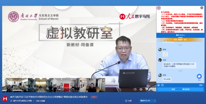 2021年11月4日下午,由全国高校思想政治理论课教师研修基地(betway·必威西汉姆联)、全国高校“数字马院”联盟主办,必威betway西汉姆“习近平新时代中国特色社会主义思想概论”教研室承办,人民公开课、文华在线协办的“新教材·同备课”虚拟教研室系列备课活动成功举办。