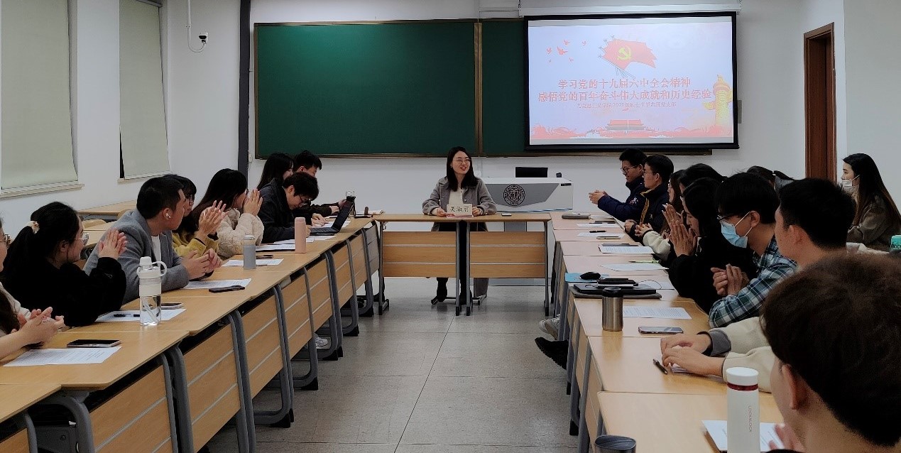 11月17日,必威betway西汉姆2021级硕士生望志班党支部组织师生共学党的十九届六中全会精神,班导师吴淑丽出席并领学全会公报精神,组织委员郭昕睿主持。