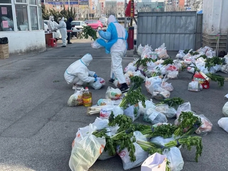 19号一早,水岸华庭社区大门口搭起了一个大帐篷,帐篷上写着生活物资保障临时服务点,刘明明一问才知道,天津食品集团进驻津南区的封控区、管控区,全力保证居民蔬菜、粮油等生活必需品供应,居民通过“农鲜生活”微信小程序自主下单,送货上门。