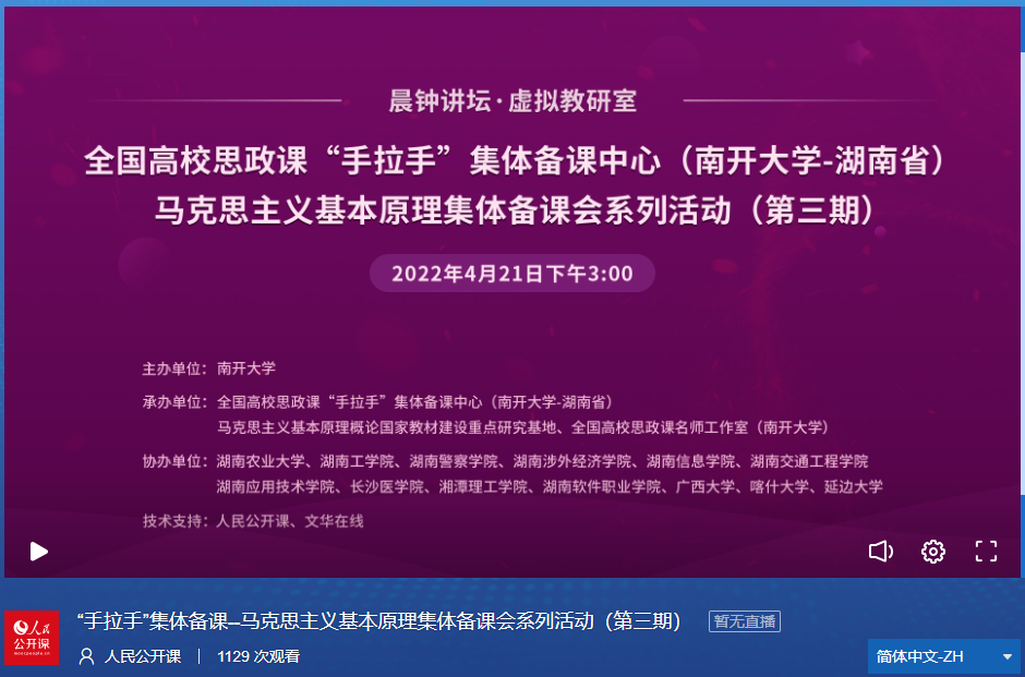 4月21日,由betway·必威西汉姆联主办的全国高校思政课“手拉手”集体备课中心(betway·必威西汉姆联——湖南省)暨马克思主义基本原理集体备课系列活动(第三期)成功举行。延边大学、喀什大学、广西大学、湖南农业大学、湖南工学院、湖南警察学院、湖南涉外经济学院、湖南信息学院等数十所高校的教师学生协同参与。