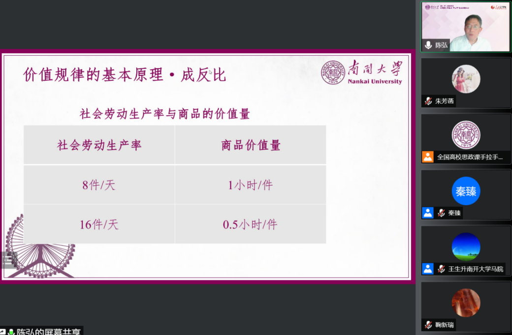 陈老师指出,价值规律本身并不复杂,但是要注意引导学生理解商品价值与现实中价格之间的区别,帮助学生理解价格围绕价值自发波动没有违背价值规律的原因。他表示,在讲解社会必要劳动时间时,可以根据学生能力和学科背景的不同,有针对性地进行设计。社会必要劳动时间的存在,将商品生产者分为两类,一类是个别劳动时间高于社会必要劳动时间的商品生产者,另一类是个别劳动时间低于社会必要劳动时间的商品生产者。对于商品生产者来说,使自身个别劳动时间低于社会必要劳动时间生死攸关。因此,在社会主义市场经济建设中,如果企业严格按照价值规律的要求来经营,企业只能通过提高劳动生产率实现发展,这将有效化解市场经济中不尽如人意的地方。他指出,可以通过讨论“技术进步带来的劳动复杂程度的变化”来帮助学生理解好简单劳动和复杂劳动的关系。他提醒,要帮助学生认识到,即使劳动生产率达到一定高度所生产的产品能满足全社会的需要时,进一步提高劳动生产率依然有意义。因为这种情况下进一步提高劳动生产率会缩减劳动时间,在一定程度上将更多的劳动者解放出来。陈老师还简要提及价值规律的积极作用和消极作用。