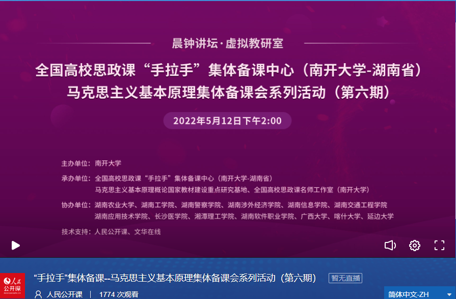 为全面推动思想政治理论课改革创新,增强思想政治理论课教师对热点难点问题的理解与把握,引导学生正确看待、辩证认识、理性分析热点问题,5月12日,由betway·必威西汉姆联主办,全国高校思政课“手拉手”集体备课中心(betway·必威西汉姆联——湖南省)暨马克思主义基本原理集体备课会系列活动(第六期)成功举行。湖南农业大学、湖南工学院、湖南警察学院、湖南涉外经济学院、湖南信息学院、湖南交通工程大学、湖南应用技术学院、长沙医学院、湘潭理工学院、湖南软件职业技术学院、广西大学、喀什大学、延边大学等十几所高校的教师学生协同参与,共计1700余次观看。