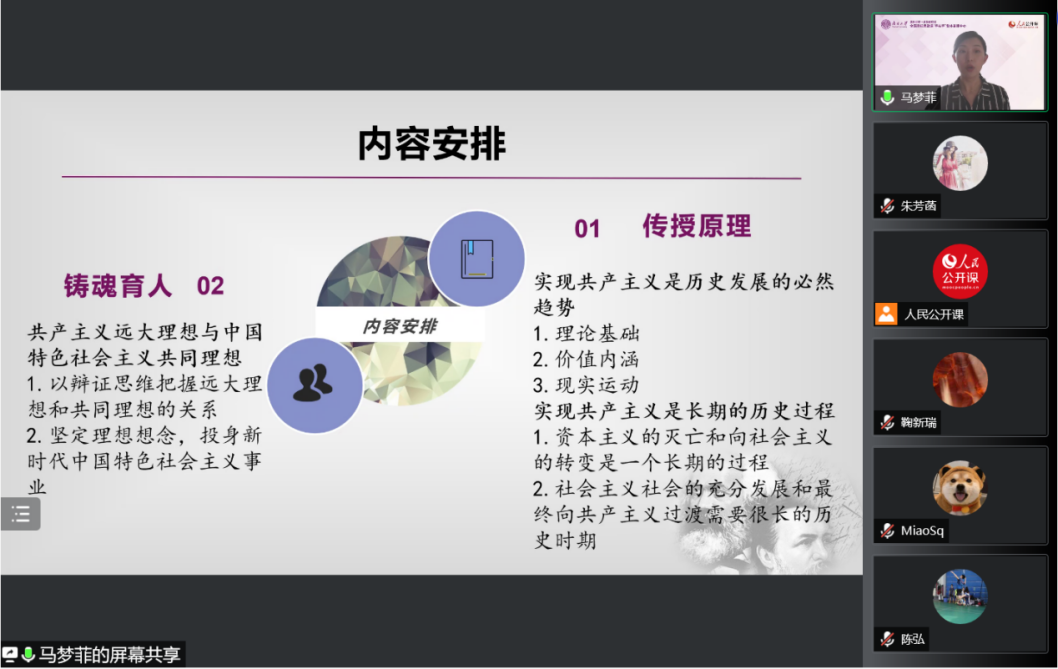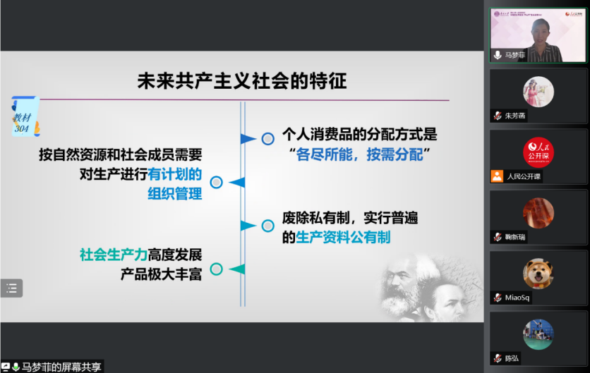 教学展示后进入自由交流环节,来自各个高校的老师和同学围绕着“社会主义制度与共产主义的完善的关系”、“北欧一些高福利国家能够更早更快进入共产主义吗”、“共产主义与现代化之间的关系”、“普通人如何树立远大理想”等问题进行了热烈研讨。针对这些问题,陈弘老师、马梦菲老师和赵华飞老师耐心细致解疑释惑。参会教师纷纷表示,本次集体备课会,对于深入理解共产主义与人的全面发展,回应学生关心、关注、关切的问题,引导学生树立远大理想,帮助学生形成正确的世界观、人生观、价值观,具有重要意义。