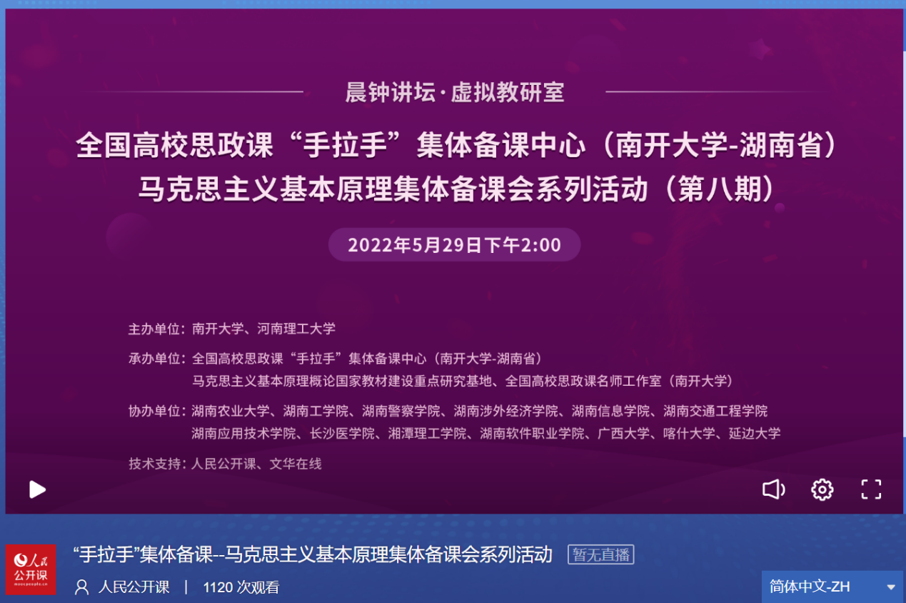 为全面提高思政课教学质量和育人水平,发挥思政课在教学体系、课程体系中的政治引领和价值引领作用,不断完善思政课教学体系,5月29日,全国高校思政课“手拉手”集体备课中心(betway·必威西汉姆联——湖南省)暨马克思主义基本原理集体备课会系列活动第二阶段正式启动,第八期集体备课会成功举行。本次集体备课会由betway·必威西汉姆联和河南理工大学主办,湖南农业大学、湖南工学院、湖南警察学院、湖南涉外经济学院、湖南信息学院、湖南交通工程大学、湖南应用技术学院、长沙医学院、湘潭理工学院、湖南软件职业技术学院、广西大学、喀什大学、延边大学等十几所高校的教师协同参与。