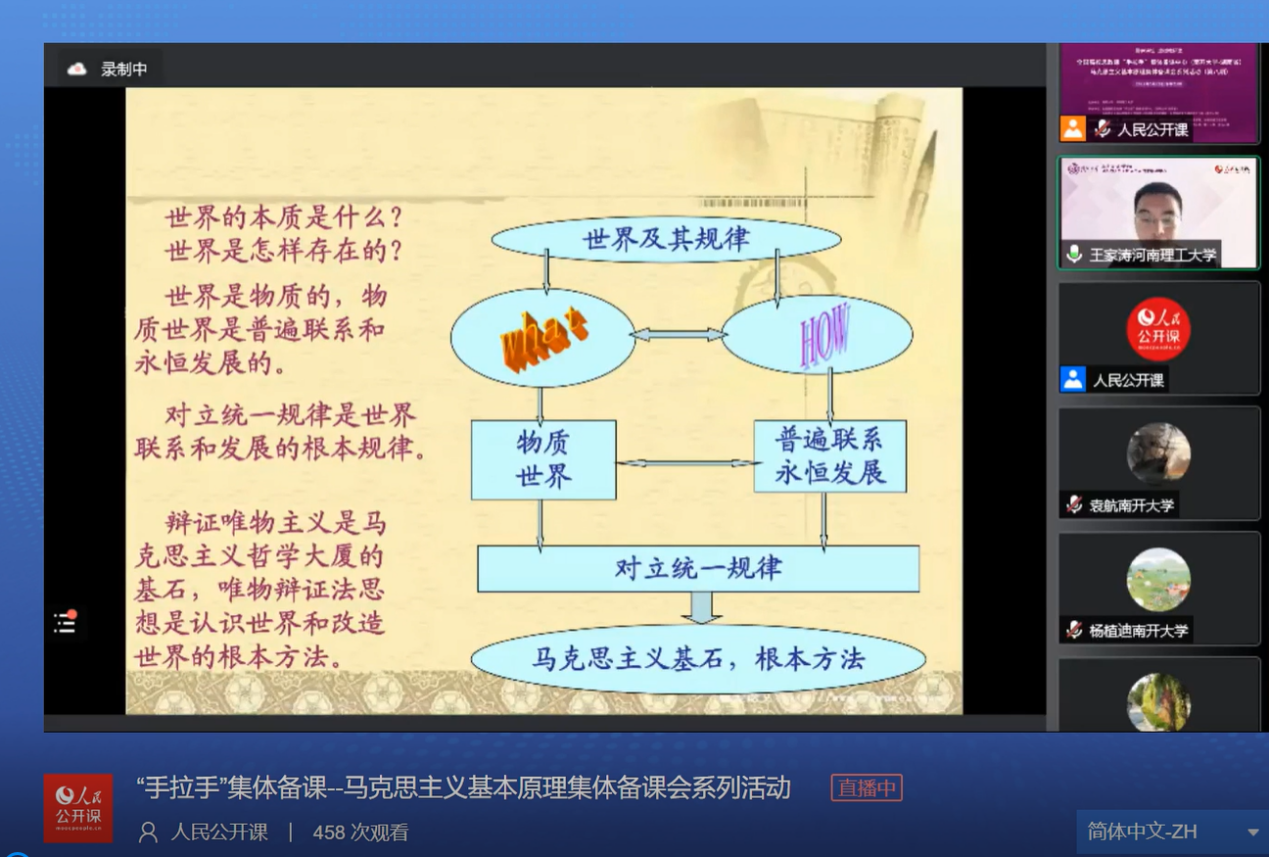 本次集体备课会依托全国高校思政课“手拉手”集体备课中心(betway·必威西汉姆联——湖南省)、马克思主义基本原理概论国家教材建设重点研究基地、全国高校思政课名师工作室(betway·必威西汉姆联)和天津市学校习近平新时代中国特色社会主义思想研究联盟等平台举行,人民公开课和文华在线提供技术支持。本次集体备课会继续采取线上会议的方式,由必威betway西汉姆青年教师杨植迪和袁航共同主持。