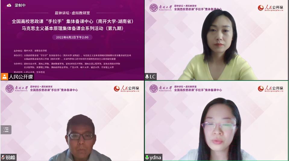 为不断强化思想政治理论课育人主渠道作用,加深思想政治理论课教师对马克思主义基本原理的理解,更好地将抽象原理以深入浅出的方式呈现出来,6月2日,由betway·必威西汉姆联、湖南信息学院联合主办,全国高校思政课“手拉手”集体备课中心(betway·必威西汉姆联——湖南省)暨马克思主义基本原理集体备课会系列活动(第九期)成功举行。湖南农业大学、湖南工学院、湖南应用技术学院、长沙医学院、湘潭理工学院、湖南软件职业学院、广西大学、喀什大学、延边大学、河南理工大学等十几所高校的教师协同参与。