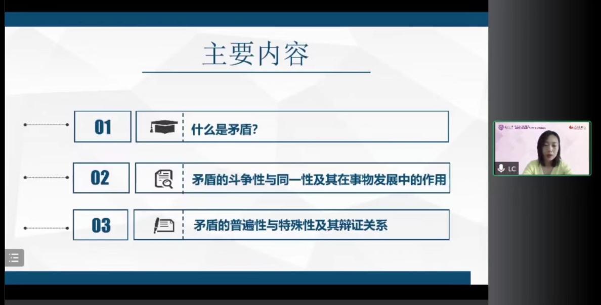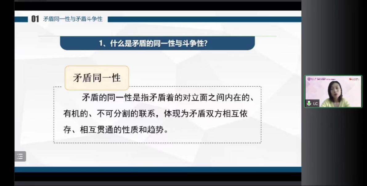 针对“矛盾的斗争性与同一性及其在事物发展中的作用”,李老师从“什么是矛盾的同一性和斗争性”、“矛盾的同一性和斗争性在事物发展中的作用”、“矛盾的同一性和斗争性的辩证关系”三个方面展开讲解。李老师指出,矛盾的同一性是指矛盾着的对立面之间内在的、有机的、不可分割的联系,体现为矛盾双方互相依存、互相贯通的性质和趋势。她引用老子《道德经》中“有无相生,难易相成,长短相形,高下相倾,音声相和,前后相随”的名言,播放电影《夺冠》的相关情节,生动解释何为“相互依存”“相互贯通”以及如何实现“相互依存”“相互贯通”。她接着指出,矛盾的同一性在事物发展中的作用表现在三个方面:第一,同一性是事物存在和发展的前提,发展是在矛盾统一体中的发展;第二,同一性使矛盾双方相互吸引有利于自身的因素,在相互作用中各自得到发展;第三,同一性规定着事物转化的可能和发展的趋势。矛盾的斗争性在事物发展中的作用表现在两个方面:第一,矛盾双方的斗争促使矛盾双方力量的变化,为对立面的转化、事物的质变创造条件;第二,矛盾双方的斗争是一种矛盾统一体向另一种矛盾统一体过渡的决定性力量。她运用“磁铁两极之间的关系”、“资本家与雇佣工人之间的关系”等例子,生动形象地说明矛盾的同一性和斗争性相互联结、相辅相成。她强调,没有斗争性就没有同一性,没有同一性也没有斗争性,斗争性寓于同一性之中,同一性通过斗争性来体现。矛盾的同一性和斗争性相结合,构成了事物的矛盾运动,推动事物的变化发展。结合这部分内容,李老师还特别结合生活经验提示道,“把对手扶起来,不仅仅是胸襟,也是一种智慧”。