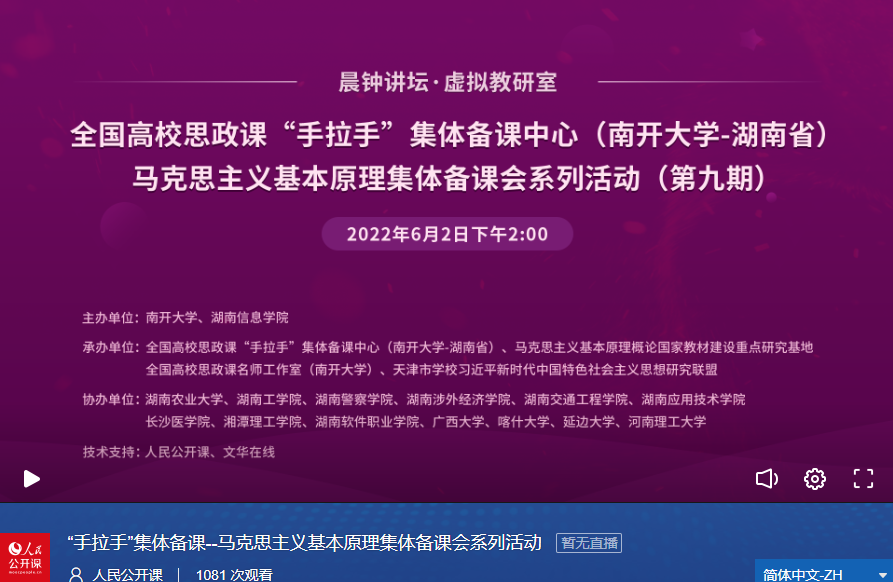 本次集体备课会依托全国高校思政课“手拉手”集体备课中心(betway·必威西汉姆联——湖南省)、马克思主义基本原理概论国家教材建设重点研究基地、全国高校思政课名师工作室(betway·必威西汉姆联)和天津市学校习近平新时代中国特色社会主义思想研究联盟等平台举行,人民公开课和文华在线提供技术支持。本次集体备课会继续采取线上会议的方式,由必威betway西汉姆孟锐峰副教授和叶冬娜副教授共同主持。