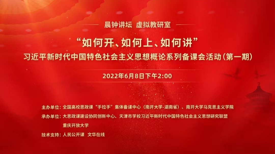为深入研讨习近平新时代中国特色社会主义思想概论课程讲授中的重点、难点、热点问题,拓宽思想政治理论课建设上的校际合作,整合优势资源,交流优秀经验,6月8日,由全国高校思政课“手拉手”集体备课中心(betway·必威西汉姆联——湖南省)、必威betway西汉姆主办,大思政课建设协同创新中心、天津市习近平新时代中国特色社会主义思想研究联盟、重庆开放大学承办的全国高校思政课“手拉手”集体备课中心(betway·必威西汉姆联——湖南省)暨习近平新时代中国特色社会主义思想概论系列备课会活动(第一期)成功举行。