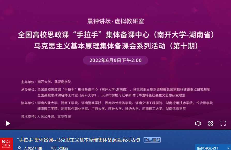 本次集体备课会依托全国高校思政课“手拉手”集体备课中心(betway·必威西汉姆联——湖南省)、马克思主义基本原理概论国家教材建设重点研究基地、全国高校思政课名师工作室(betway·必威西汉姆联)和天津市学校习近平新时代中国特色社会主义思想研究联盟等平台举行,人民公开课和文华在线提供技术支持。本次集体备课会采取线上会议的方式,由必威betway西汉姆青年教师袁蓓、赵华飞共同主持。