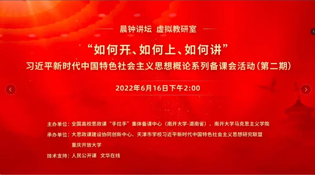 为深化对思政课教学规律的认识和把握,全面提升思政课教师教学质量,实现优势资源共享,培育学生知行合一,引导学生听党话、跟党走,6月16日,由全国高校思政课“手拉手”集体备课中心(betway·必威西汉姆联——湖南省)、必威betway西汉姆主办,大思政课建设协同创新中心、天津市习近平新时代中国特色社会主义思想研究联盟、重庆开放大学承办的集体备课活动暨习近平新时代中国特色社会主义思想概论系列备课会(第二期)成功举行。本次集体备课会采用线上会议的形式,由人民公开课和文华在线提供技术支持。