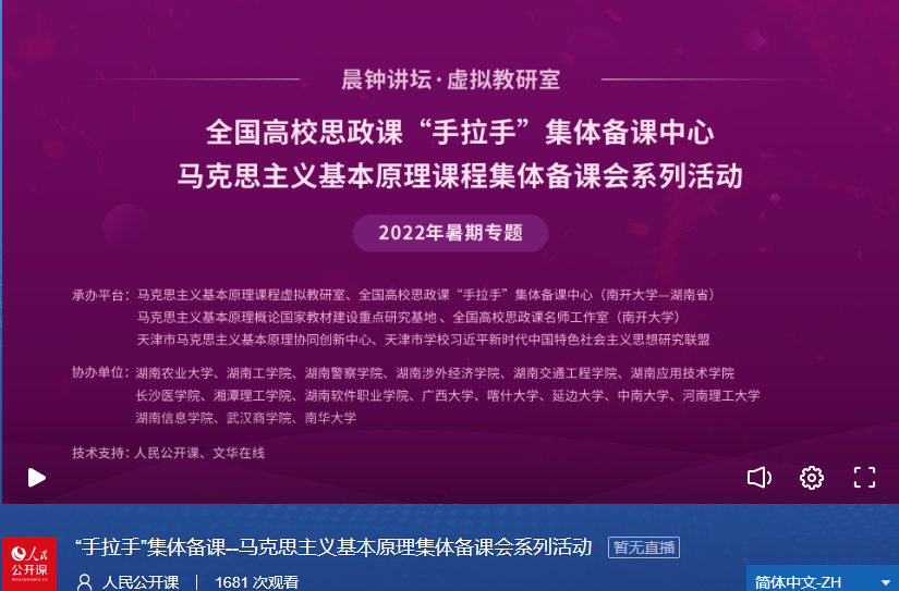 为善用“思政大课堂”传播中国声音,更好把握历史、现在和未来三个维度,讲好中国共产党人耕耘在“希望的田野”上的故事,8月14日,由betway·必威西汉姆联主办,全国高校思政课“手拉手”集体备课中心(betway·必威西汉姆联——湖南省)暨马克思主义基本原理集体备课会系列活动(暑期专题)成功举行。湖南农业大学、湖南工学院、湖南警察学院、湖南涉外经济学院、湖南交通工程大学、湖南应用技术学院、长沙医学院、湘潭理工学院、湖南软件职业技术学院、广西大学、喀什大学、延边大学、中南大学、河南理工大学、湖南信息学院、武汉商学院、南华大学等十几所高校的教师学生协同参与,共计1600余次观看。