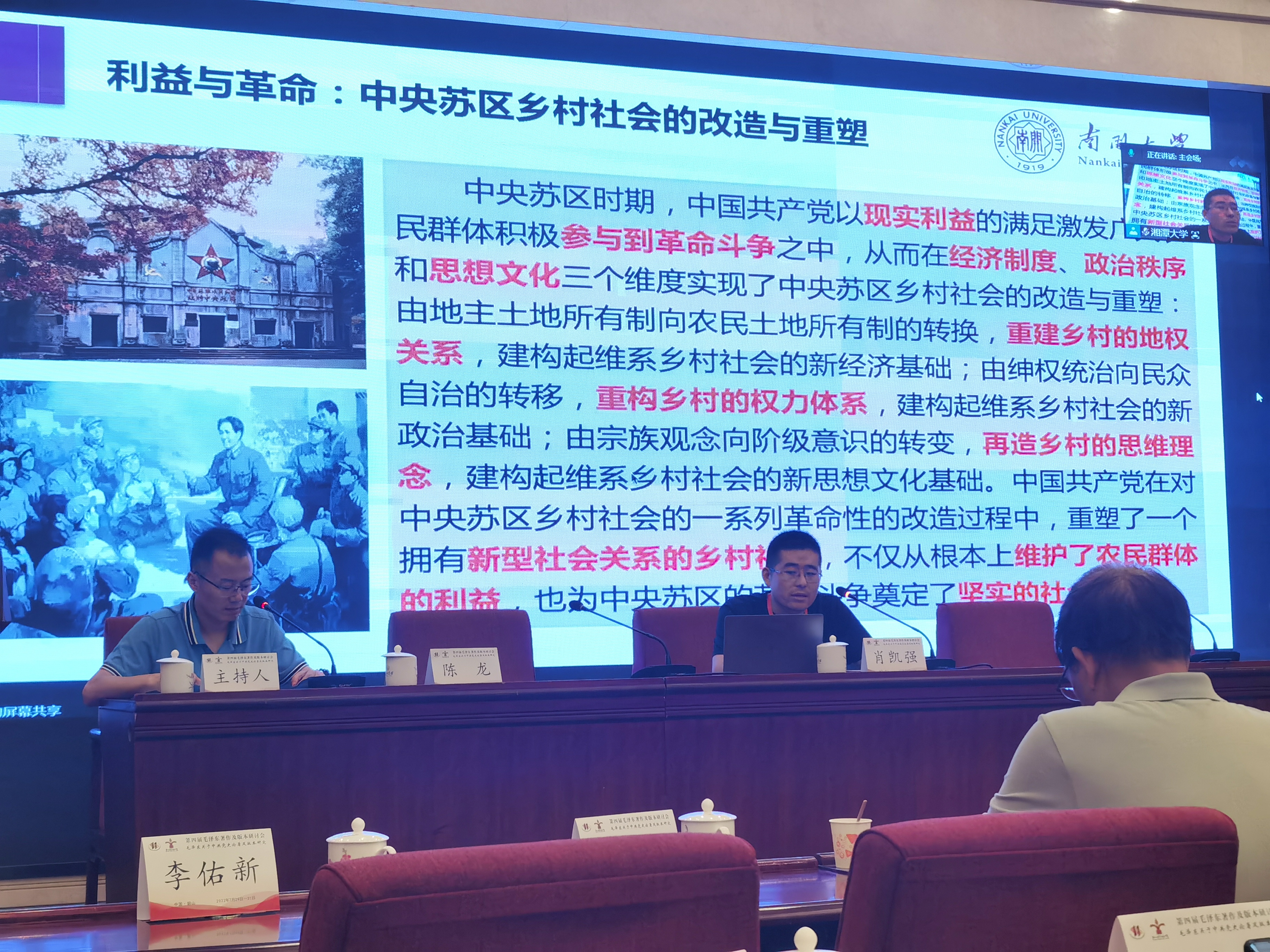 与会专家学者围绕“毛泽东关于中共党史论著及版本研究”的主题展开了研讨。会议开幕式由湘潭大学毛泽东思想研究中心主任李佑新教授主持,韶山管理局副局长付维华、湘潭大学副校长罗定提教授、中共中央党史和文献研究院对外合作交流局局长杨明伟研究员先后致辞,中国海洋发展基金会理事长吕滨致贺辞。来自中共中央党校、中共中央党史和文献研究院、中国社会科学院、国防大学、北京大学、清华大学、betway·必威西汉姆联、武汉大学、中山大学、华南师范大学、湖南省社会科学院、中共湖南省委党史和文献研究院等高校和研究机构,以及人民出版社、《光明日报》《求索》《毛泽东研究》等媒体单位的100余名代表参加了研讨会。我院21级博士生肖凯强以《利益与革命:利益与革命:中央苏区乡村社会的改造与重塑——以<毛泽东农村调查文集>为中心的考察》论文受邀参会,并在第四场研讨会上进行汇报发言。