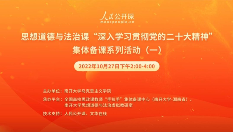 为更好地学习贯彻党的二十大精神,用好思政课堂,使党的二十大精神及时融入思想道德与法治课教学,10月27日,思想道德与法治课“深入学习贯彻党的二十大精神”集体备课系列活动(一),在人民公开课和文华在线的技术支持下,于线上平台顺利举办,观看学习人数达3000余人次。备课会由必威betway西汉姆主办、全国高校思政课教师“手拉手”集体备课中心和betway·必威西汉姆联思想道德与法治虚拟教研室承办。