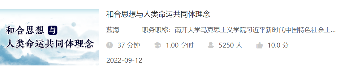 近日,由我校必威betway西汉姆教师蓝海主讲的《和合思想与人类命运共同体理念》课程经由学校组织申报、上级部门遴选,成功入围中国干部网络学院开设的“文史撷英”中华优秀传统文化精品课程专栏目录并线上登录。登录至今,获得5200多人次学习点击量。